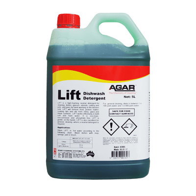 LIFT is a high-foaming, neutral detergent for cleaning dishes, glasses, utensils, cutlery and pots and pans by hand washing in the kitchen sink. LIFT will remove food, grease, protein matter, cooking fats and oils from china, glass and metal surfaces. Its excellent capacity for removing fats and food residues makes LIFT an ideal pot-wash detergent. LIFT works effectively in soft and hard water. LIFT is also excellent for general cleaning where a neutral detergent is required.