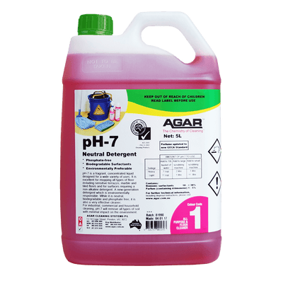 pH-7 will remove all soil and spillages including foodstuffs, drinks, cooking oil and general traffic dirt from all types of floors and other surfaces. It is recommended for use on alkali-sensitive surfaces such as terrazzo, marble or ceramic tiles. No rinsing is required.