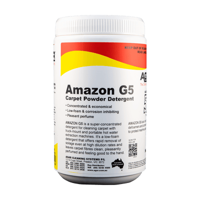 Amazon G5 is a concentrated powder detergent for carpet cleaning with hot water extraction machines. It has a very powerful cleaning action that gives brilliant results even on the most heavily- soiled carpets.