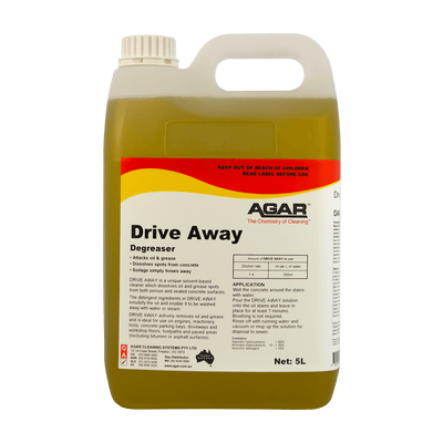 - DRIVE AWAY emulsifies with water allowing oil and grease to be simply hosed away.