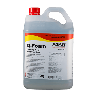 Q-FOAM is a concentrated acidic, foaming cleaner and sanitiser for use in food processing and beverage production areas. It is designed to remove stubborn protein, scale, milkstone and rust from typical food processing surfaces.